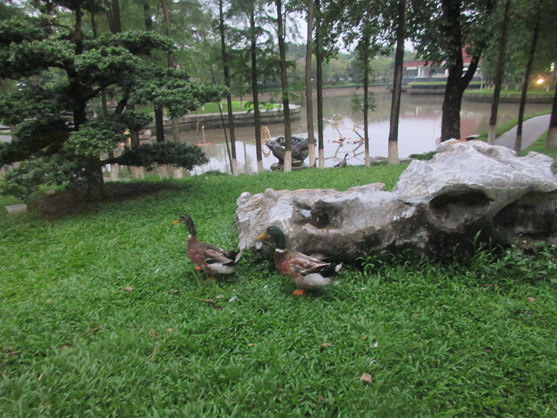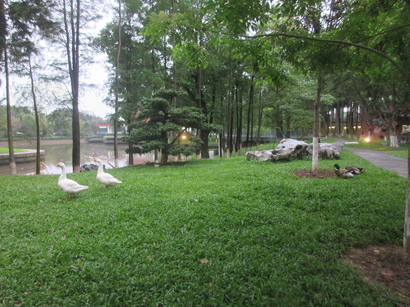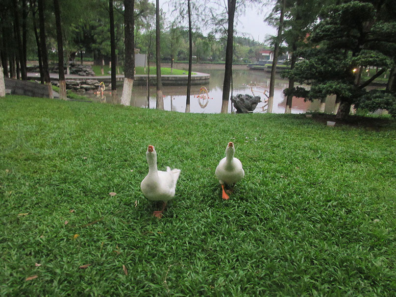 广美东湖边草地里这几只大白鹅还是鸭等的是不是已经长大了 有两个都会追着人跑了