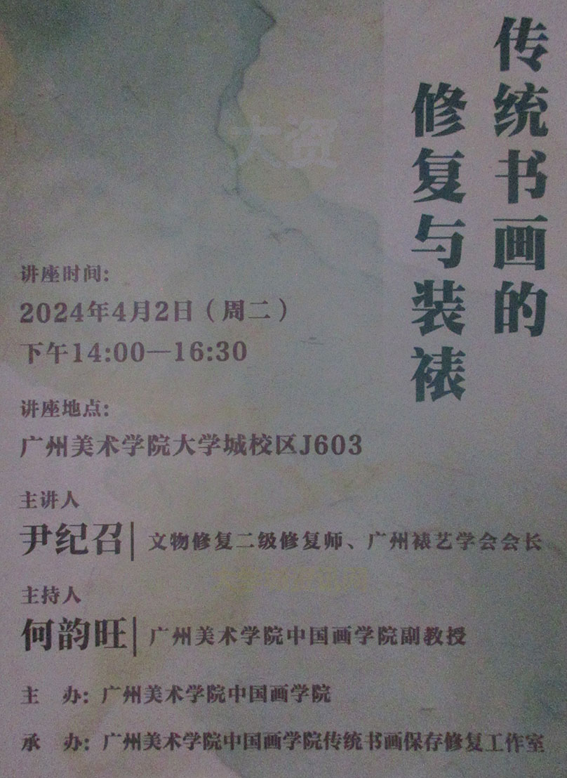 广美-国画-传统书画的修复与装裱-讲座 2024.04.02周二下午14点-16点30 教学区J栋603 主讲-尹纪召 |