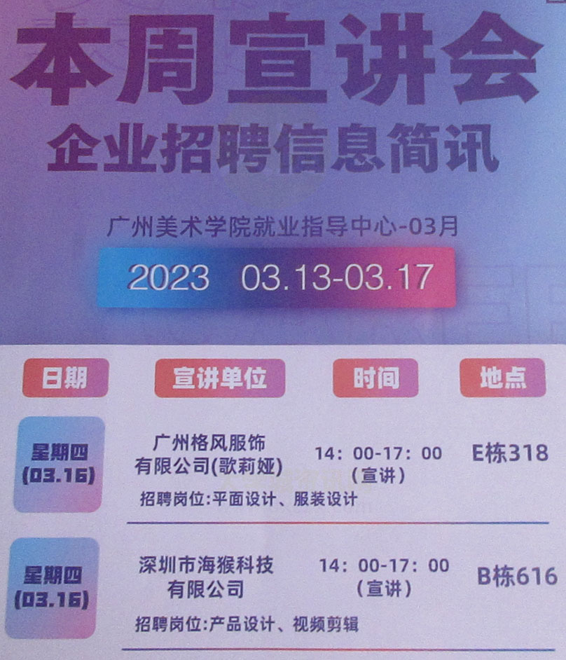 | 广州格风服饰有限公司(歌莉娅) 宣讲会 时间03.16周四下午14点-17点 教E栋318 招聘岗位-平面设计、服装设计 | ||||||