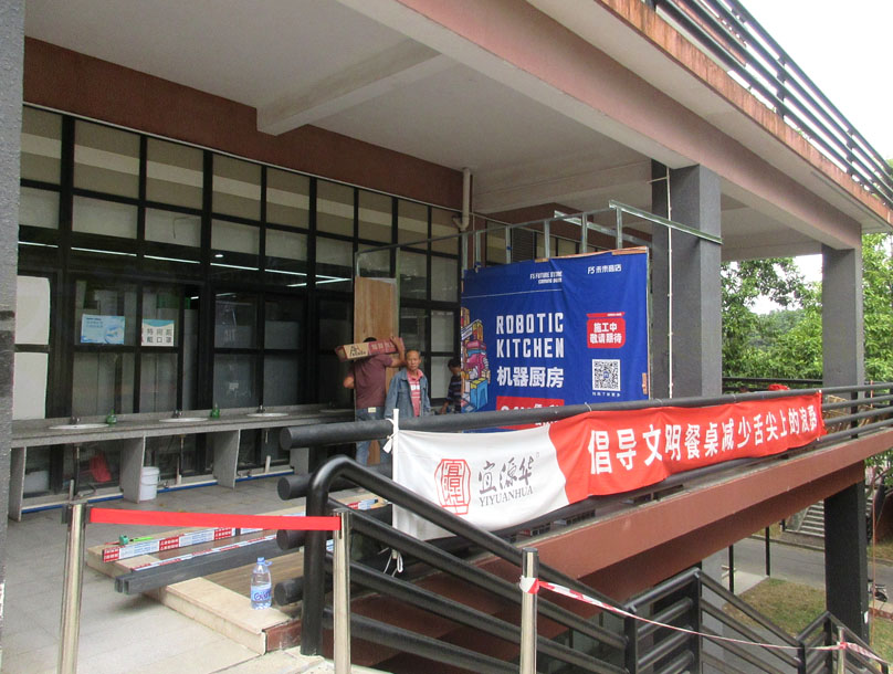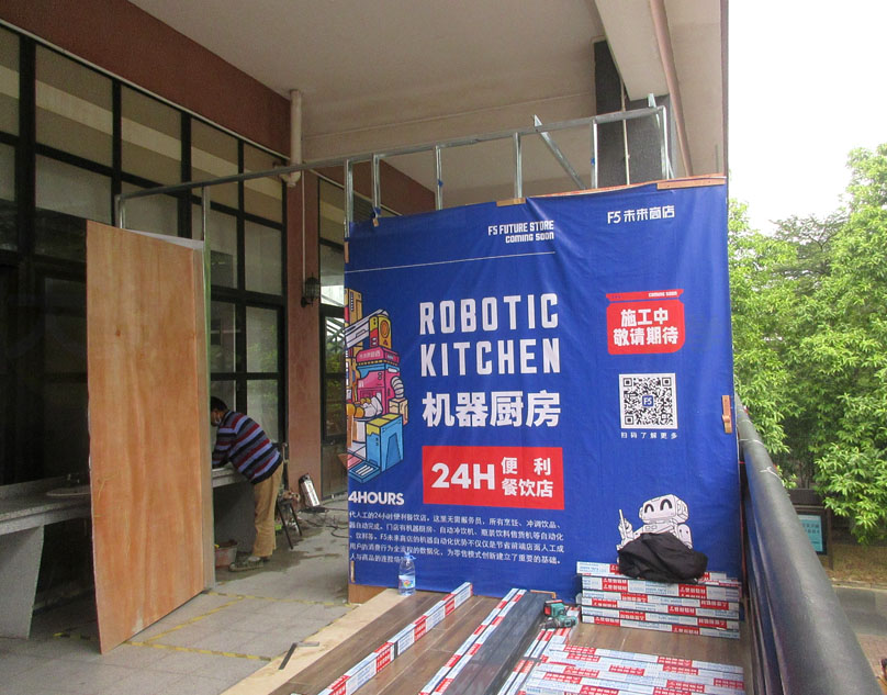 广美饭堂二楼正门北侧看到好像在装修一个叫什么机器厨房的24小时餐饮便利店 细看原来又是F5未来商店 这个自助形式的新型饮食店 目前在大学城内华工生活区有一家,之前在广大商中也开过,不过后来没开了