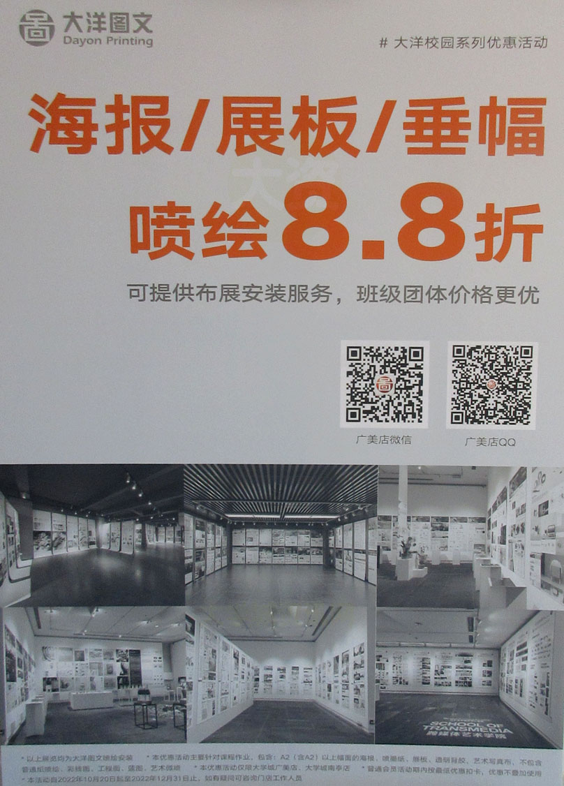| 广美生活区1栋一层-大洋图文 海报/展板/垂幅/喷绘8.8折 可提供布展安装服务,班级团体价格更优 | ||||||