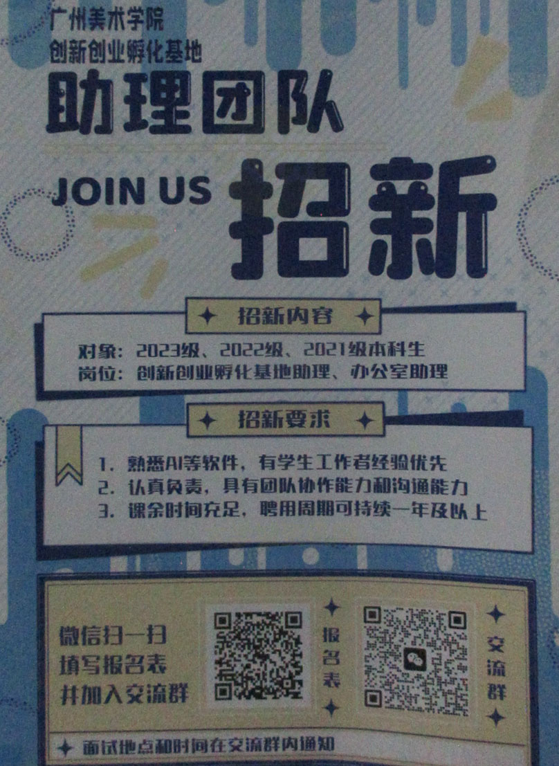 | 广州美术学院创新创业孵化基地助理团队招新 扫码填写报名表or加入交流群 | ||||||