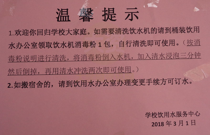 | 饮水机需消毒清洗温馨提示&如搬换宿舍的要变更手续方可订水 | ||||||