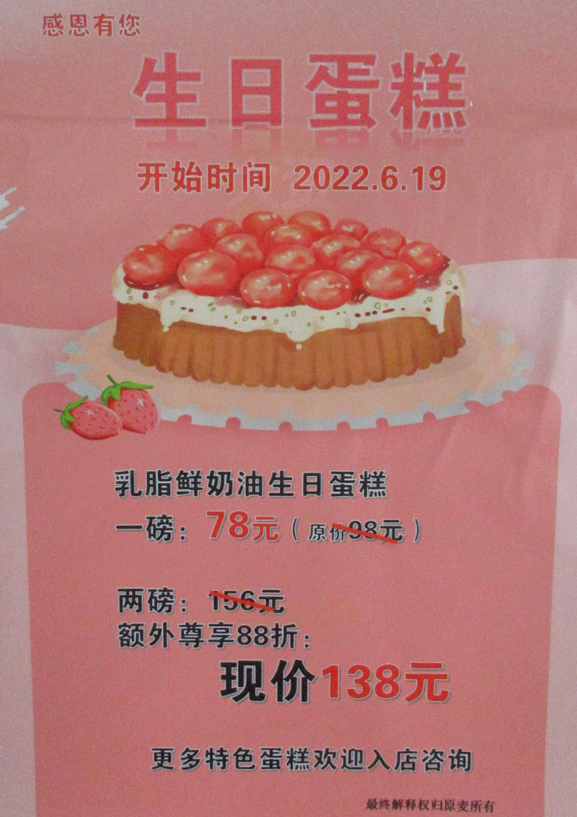 | 广美生活区1栋一楼西侧-原麦物语蛋糕店 乳脂鲜奶油生日蛋糕一磅78元(原价98元)两磅额外尊享88折现价138元 开始日期2022.6.19 | ||||||