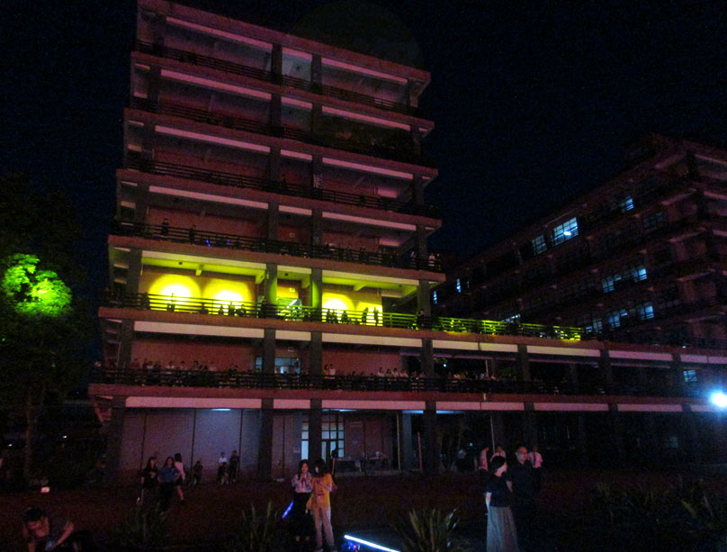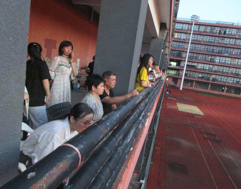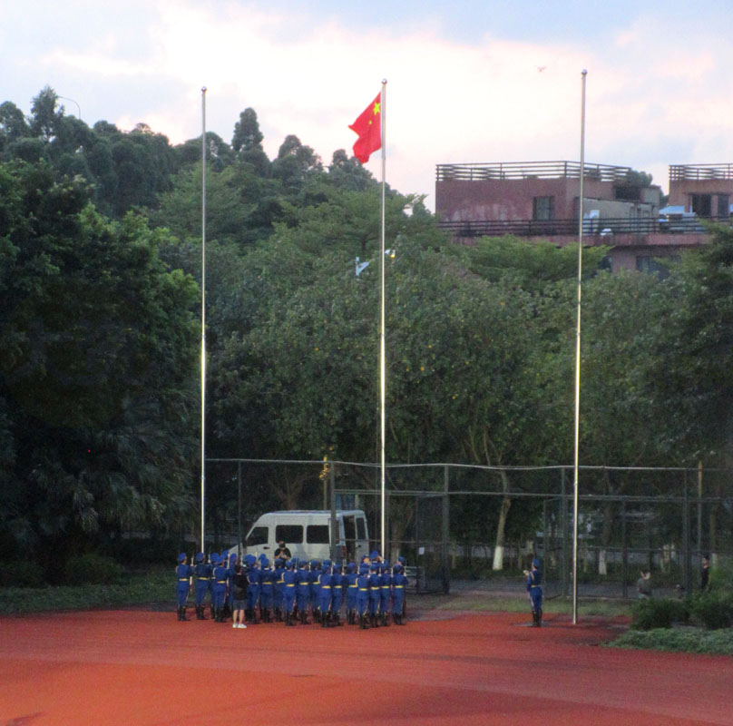 广州美术学院2022届学生毕业典礼 印象中,也是这么多年来,第一次破天荒地选择在晚上(傍晚时分)和选择在室外露天环境来进行 场内场外都挺热闹的,除了毕业生,其它观看的人也不少些,尤其教学楼C栋西侧朝田径场廊台,这其中,也可见应该是一些部分毕业生的家长or亲戚朋友,挨着围栏,这在这近两年多来,已算是稀有场面了 典礼开始的时间,已是在傍晚的7点,尽管白天太阳很暴晒,这个时候,阳光的余热已经客气很多了,想必这也是典礼选在户外的前提下而又专门定在晚间的挺大原因 典礼开场前,先来了两个暖场或者说带动气氛的节目表演,首先是一个广美的校级啦啦操,伴随着舞动的音乐节奏,场面瞬间就欢快起来了,接着是男女合唱了一曲,听着也还可以 接着典礼算是正式开始,一如既往地,广美这几年比较大型的活动,基本都是由副院长蔡拥华教授主持,蔡院长的发型本身就很有风格特点,辨识度相当高,在广美也可说是独树一帜的,加上带着学士帽,同学们看到,都不由得发出一阵会心欢笑,非常喜乐 首先,升国旗仪式,看到,广美国旗护卫队,着装上也有了最新的统一配备,颜色外观远看就醒目又不失庄重