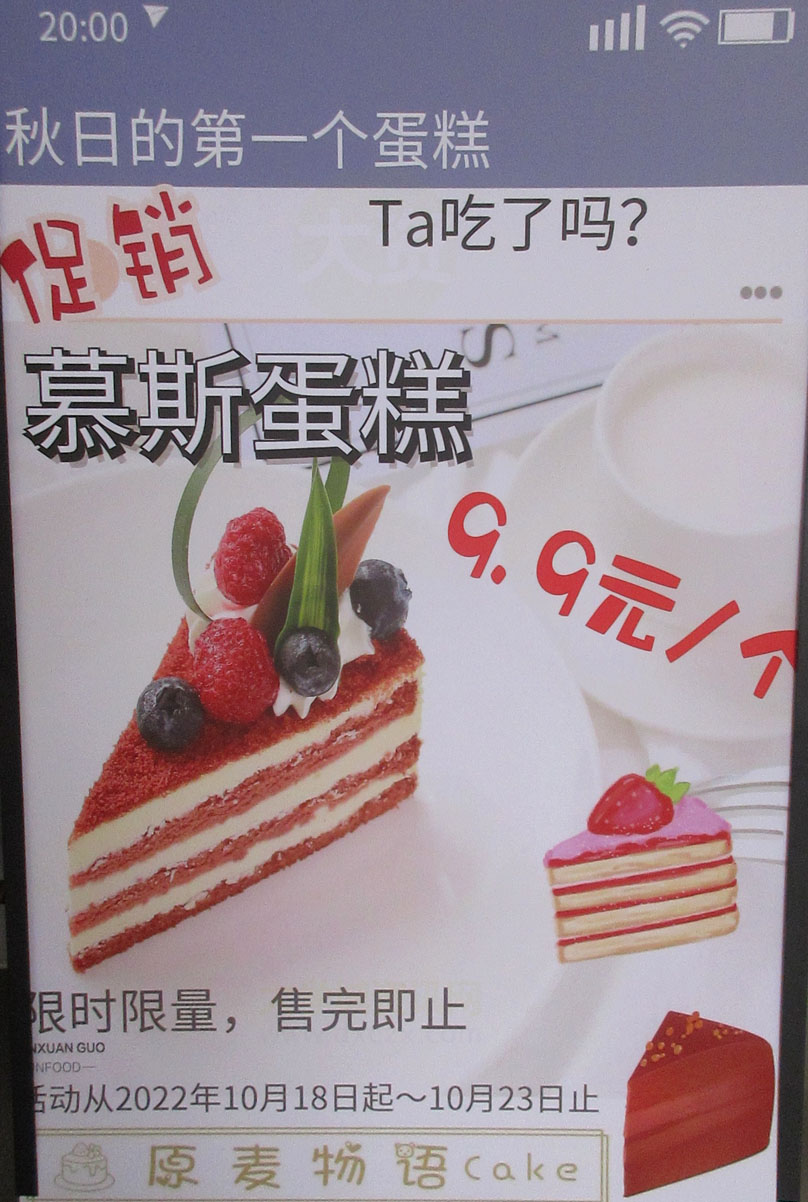 | 广美生活区宿舍1栋一层西北角 原麦物语 秋日的第一个蛋糕 慕斯蛋糕9.9元1个 限时限量,售完即止 2022.10.18-2022.10.23 | ||||||