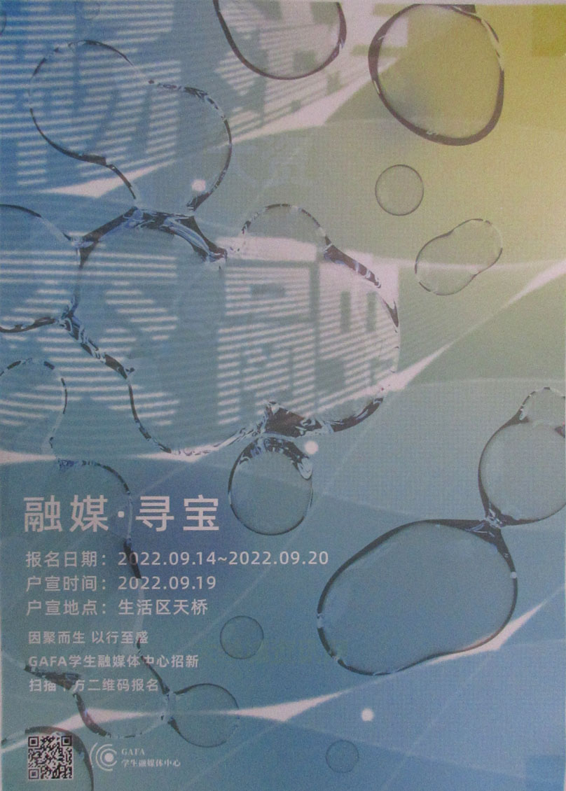 | 融媒·寻宝-GAFA学生融媒体中心招新 报名日期2022.09.14-2022.09.20 户宣2022.09.19生活区天桥平台 | ||||||