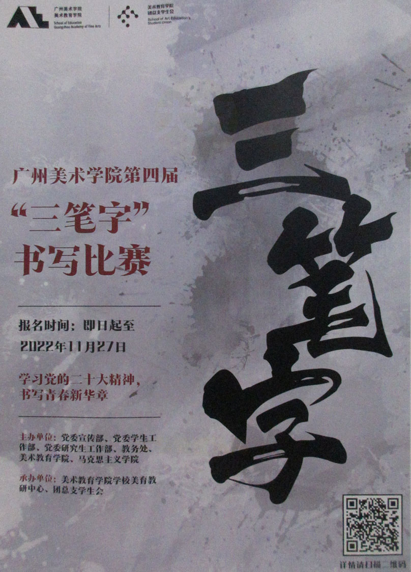 | 广州美术学院第四届三笔书写比赛 报名时间:即日起至2022.11.27 扫码了解详情 | ||||||