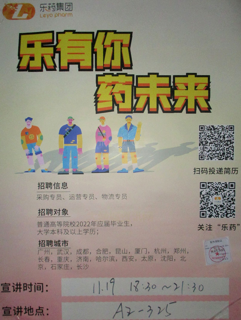 | 广药 校招 乐有你药未来 乐药集团2022校招宣讲会 11.19 18.30-21.30 A2-32 | ||||||