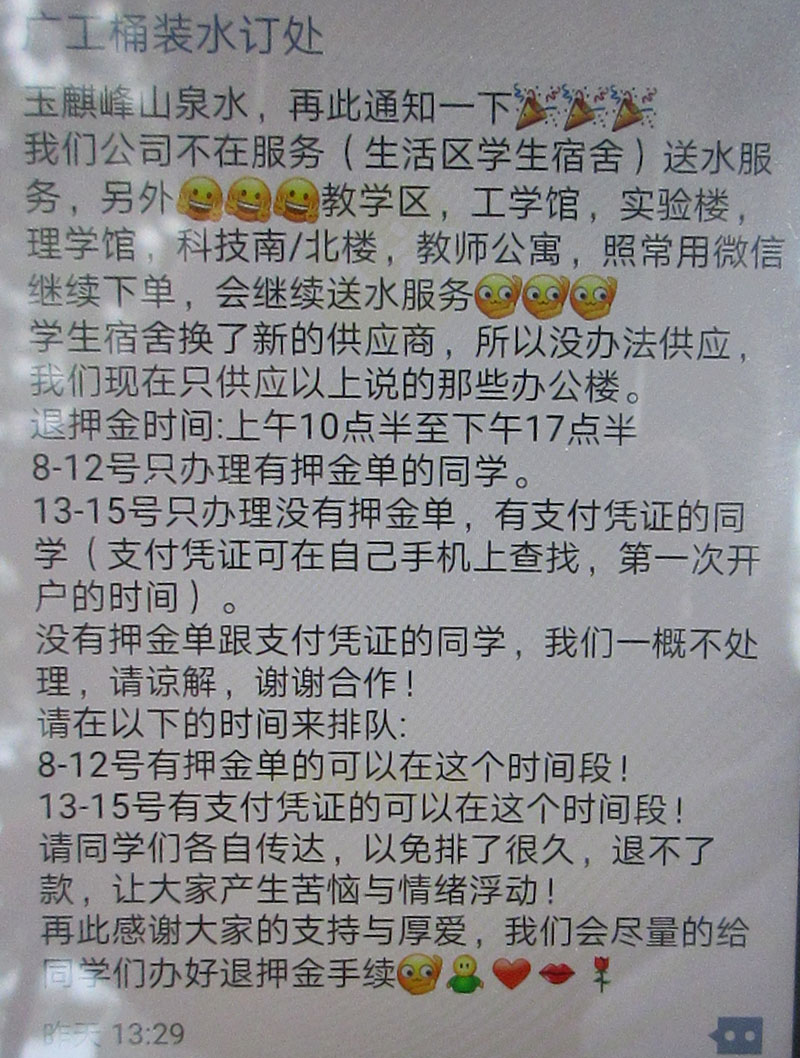 | 东区东九栋玉麒峰桶装水不该供应生活区宿舍,大量学生排队退押金,10.10周四中午时分 | ||||||
