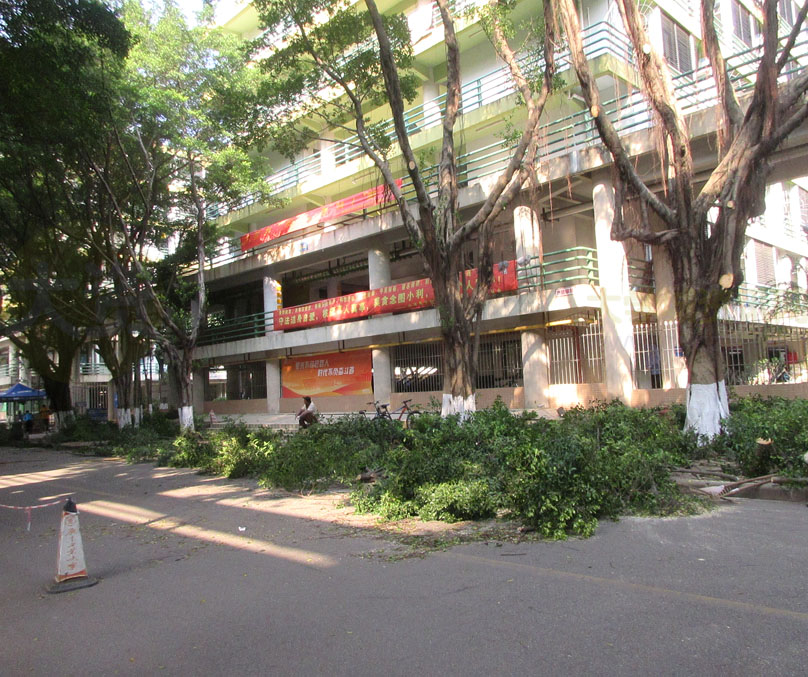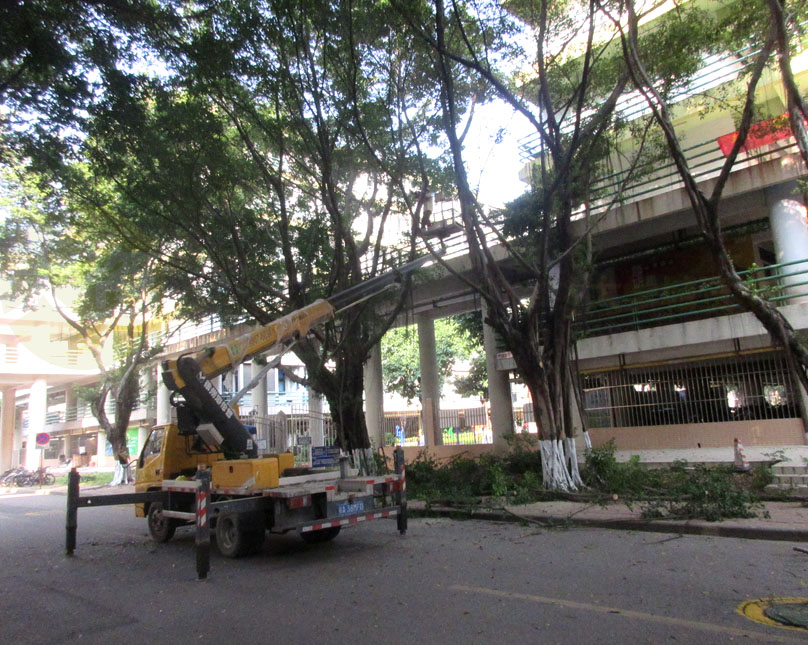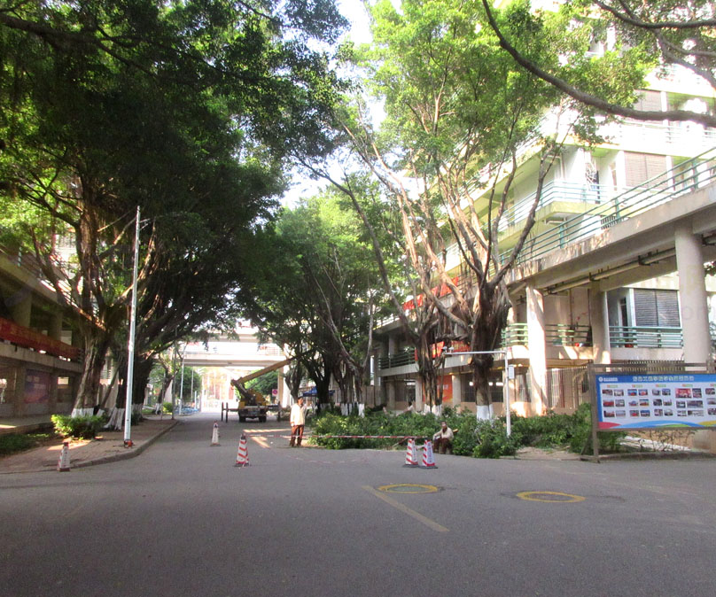 | 西区西二栋与西八栋之间主校道 看到正在给茂密的树木修剪枝干 | ||||||