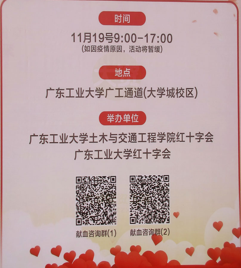 | 红十字会无偿献血活动今天下午继续在东九前中环下穿通道西侧进行 全天献血时间为上午9点到下午17点 | ||||||