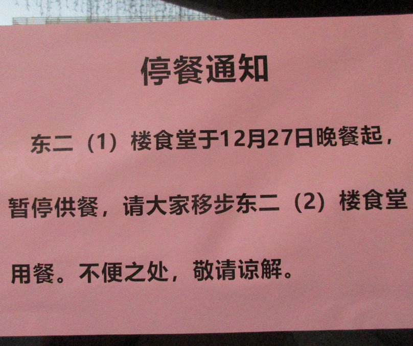 | 东区二饭一楼从12月27日晚开始放假,明年开学几时恢复供餐没说 东区二饭二楼寒假到过年期间有开 | ||||||