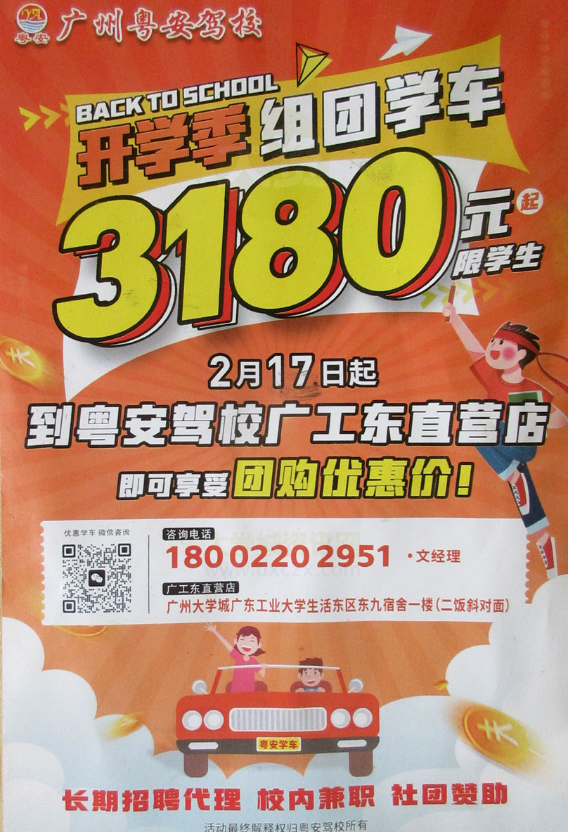 | 粤安驾校开学季 组团学车 3180元起 限学生 2月17日起到广工东直营店,即可享受团购优惠价 | ||||||