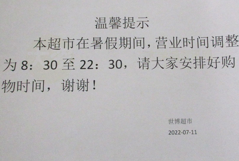 | 东区世博超市暑假营业时间为上午8点半到晚上10点半 | ||||||
