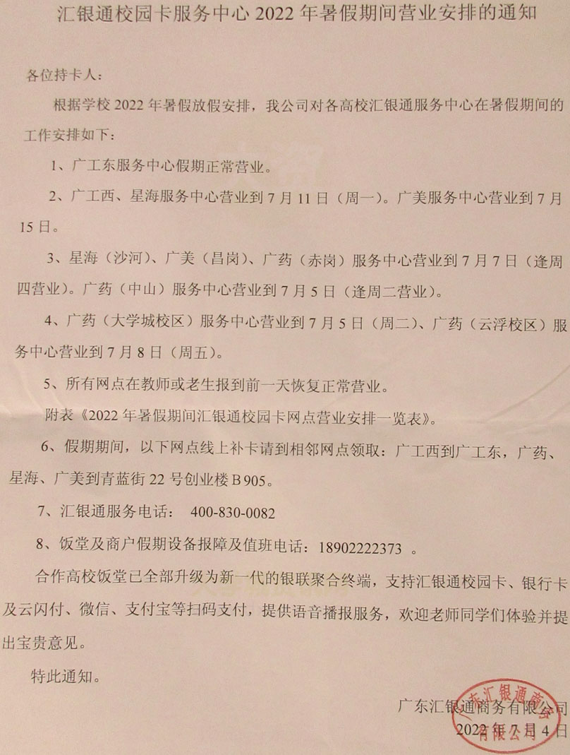 汇银通校园卡服务中心2022年暑假营业时间安排 就广工东区东十楼下的正常营业 其它网点基本是放假