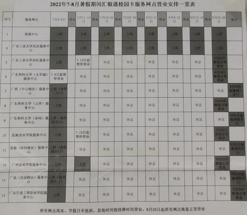 | 汇银通校园卡服务中心2022年暑假营业时间安排 就广工东区东十楼下的正常营业 其它网点基本是放假 | ||||||
