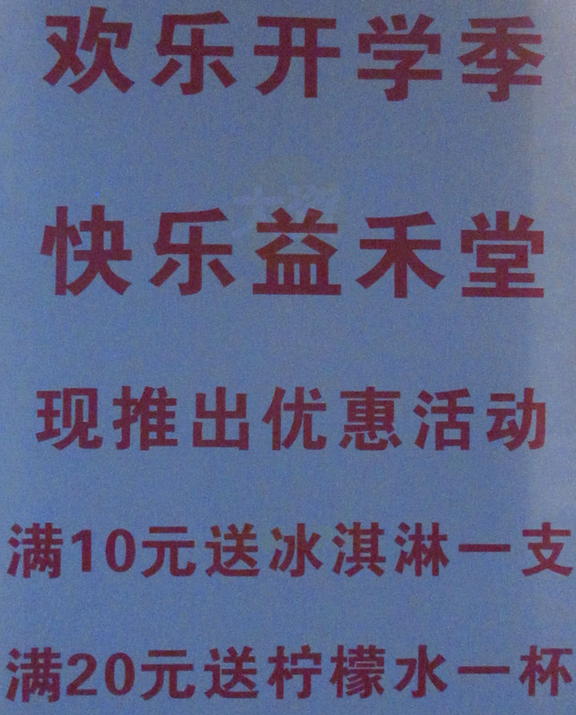 | 东区商业楼 益禾堂茶饮 欢乐开学季 现推出优惠活动 满10元送冰淇淋一支,满20元送柠檬水一杯 | ||||||