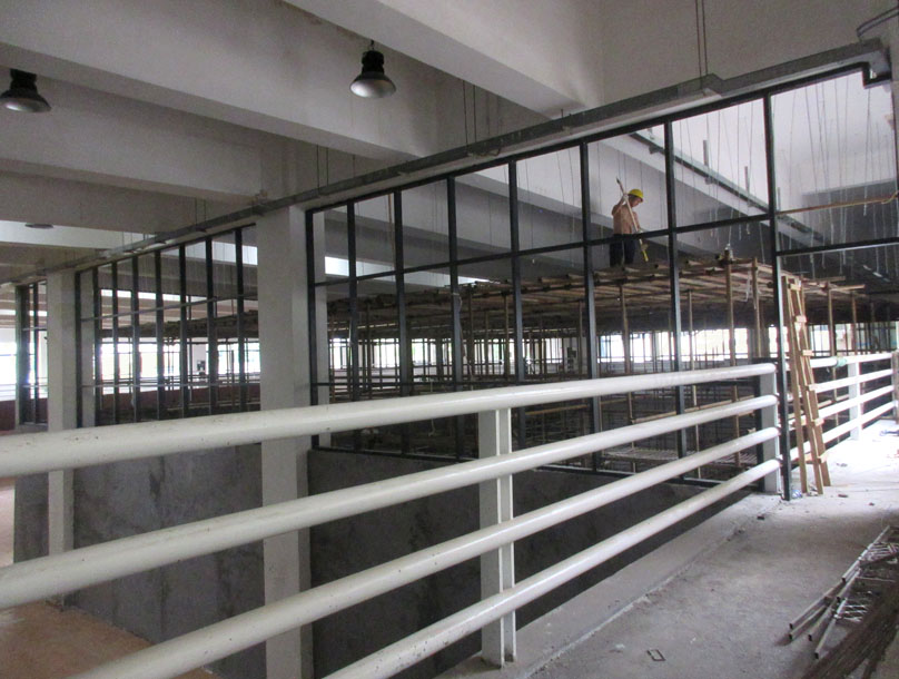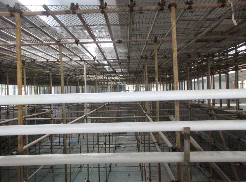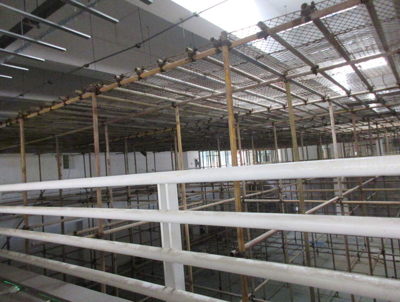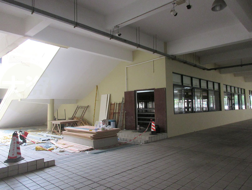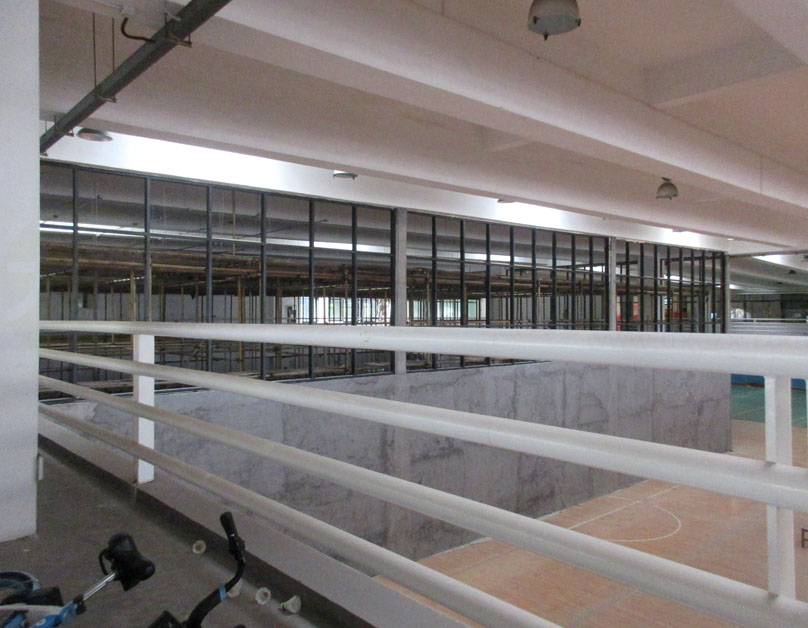 不知是要重新弄成一个怎样的效果或者说是做别的,目前看到在吊天花板,现场施工的也说不太清楚是做啥,是不是体育馆延伸的新办公室空间之类的