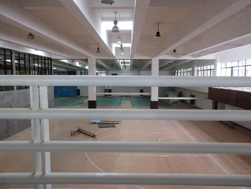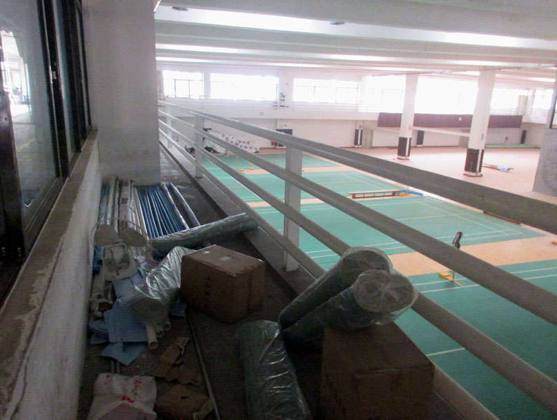 | 体育馆东侧,羽毛球场南区木质地板场也又在似进行施工改造建设装修 | ||||||