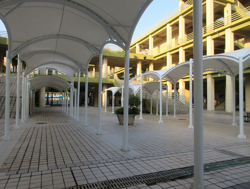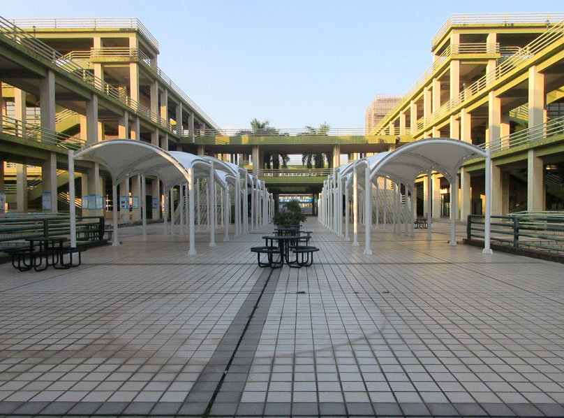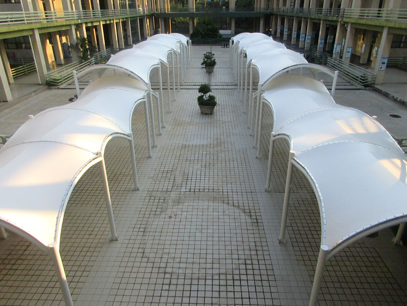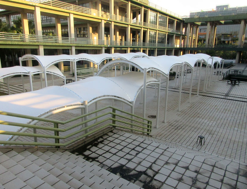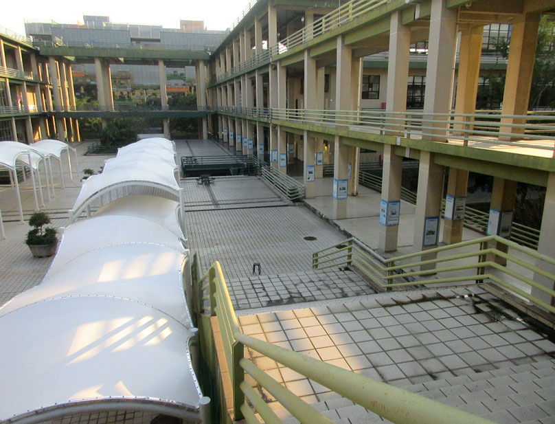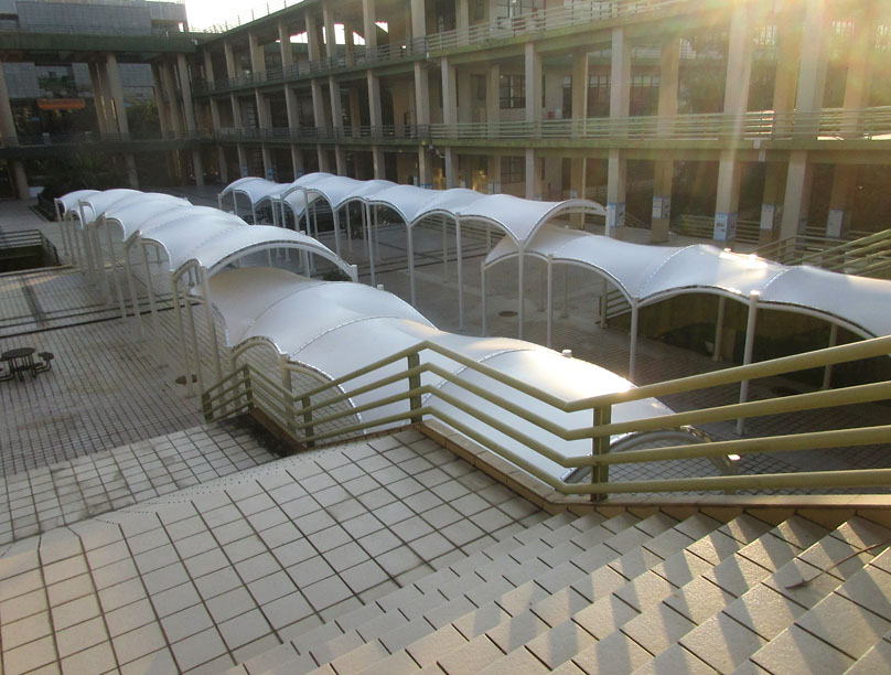 教学区教三教四与教五教六之间空地中央 之前看到的类似廊道连棚工程也已经弄好了喔 落成效果是这样的 看起来也没想象得那么密实立体占空间 是主要作为景观视象还是里面摆些桌椅让人闲聊或吃喝等
