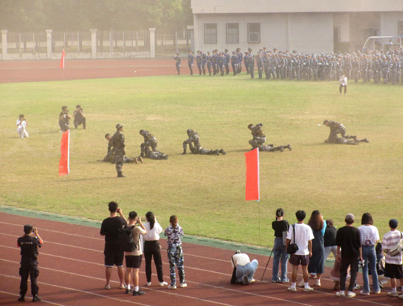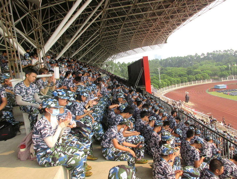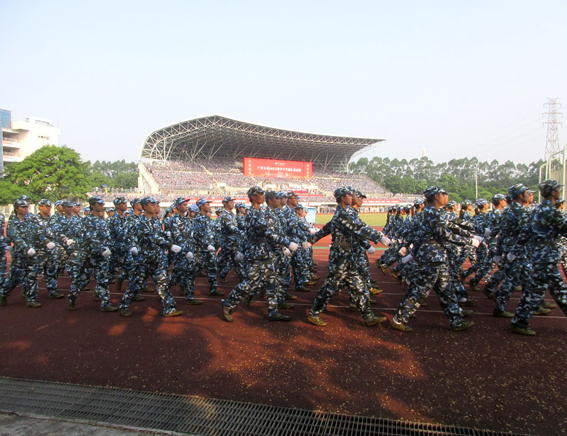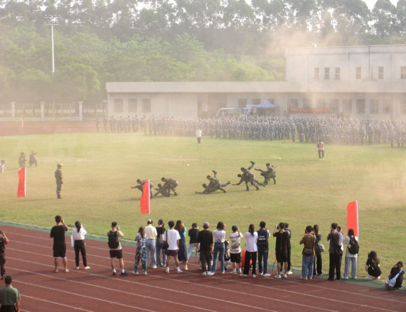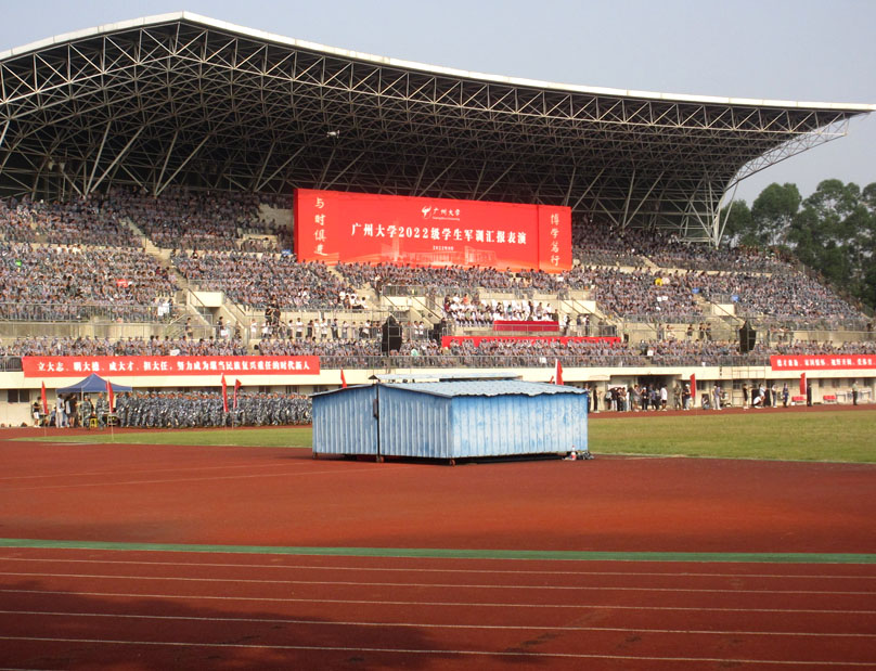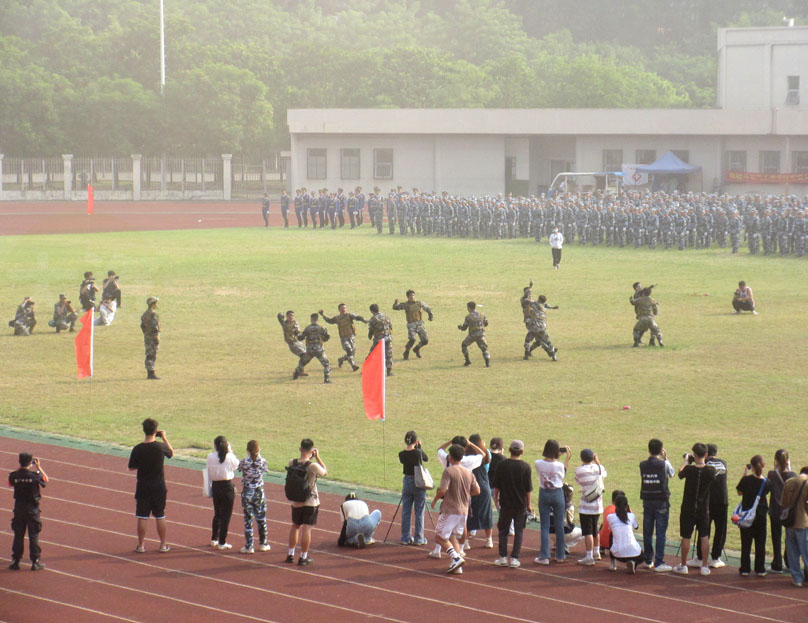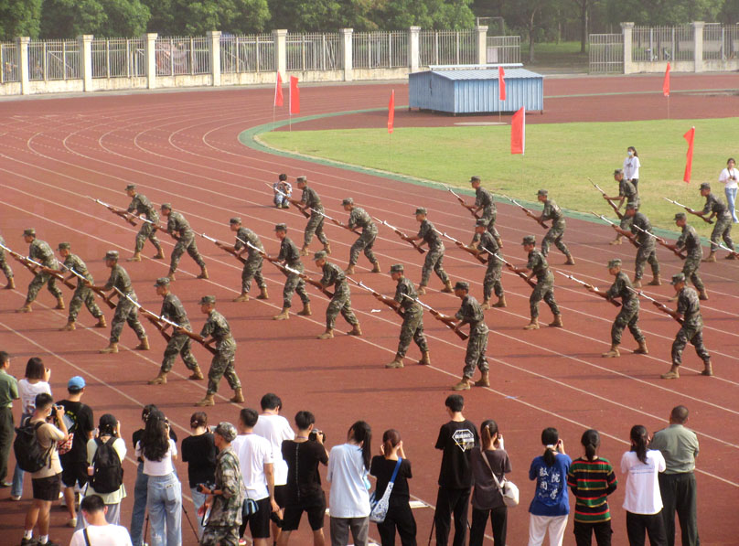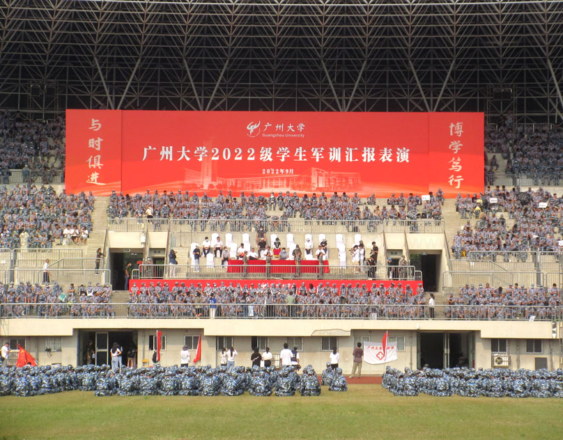 广州大学2022级新生军训汇报表演今上午在教学区运动场进行