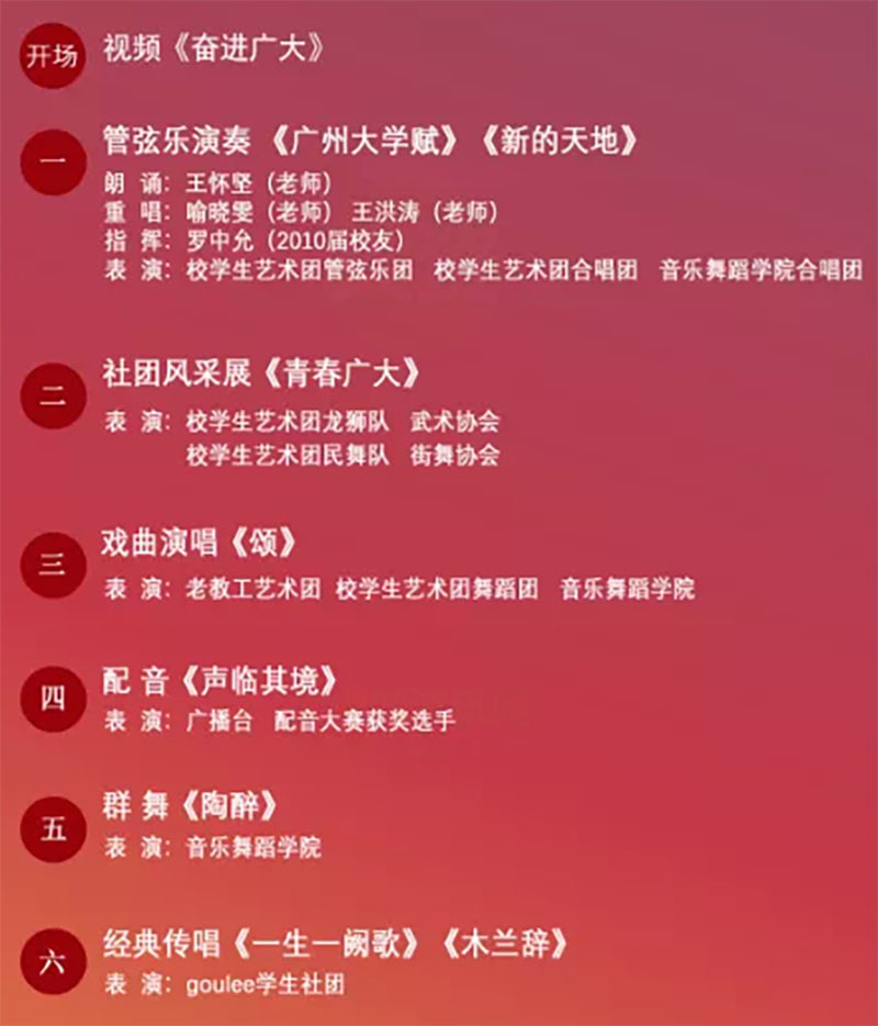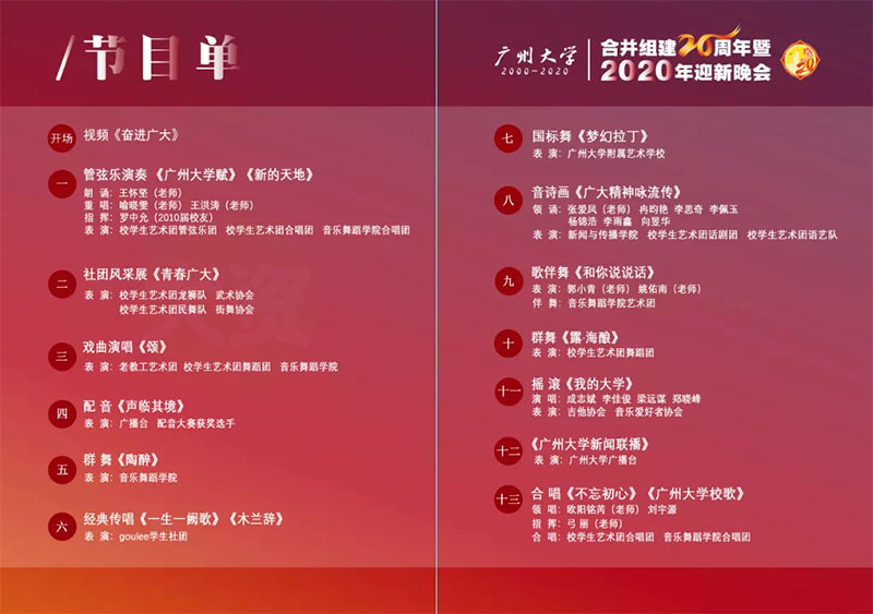 | 广州大学合并组建20周年迎新晚会节目单公布 | ||||||