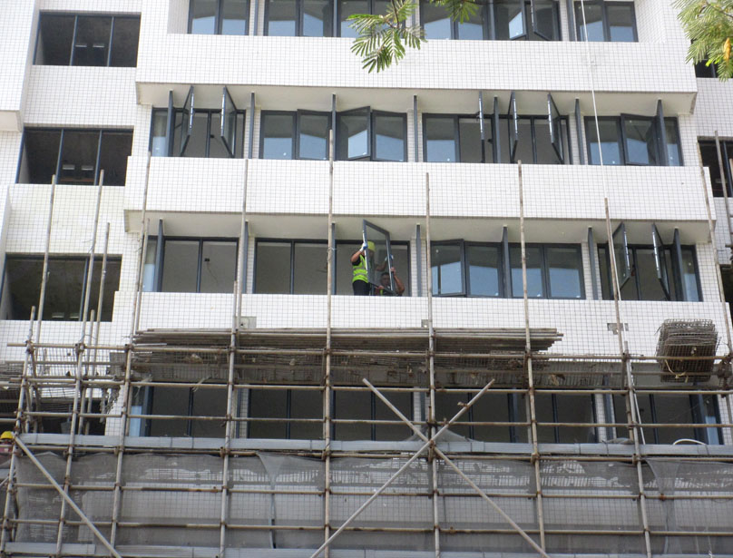 广大生活区商业中心北侧&红棉路边新建的另一处教师公寓楼 目前看到也已经开始拆施工棚架了,外墙瓷片从上到下似乎都已经贴好,玻璃门窗正在从上往下逐层安装;该处楼只是一独栋,大体呈正方形体,相较教学区东部新建的园区式多栋组合自然是要显小单一些;此处建一栋楼,有些打破了商业中心整体一块的相对独立性,但既然是要建,又没什么足够地方,应该是这栋楼是挺必要建;现在感觉是商业中心北部附着了一栋不怎么相关的楼,原本这里这个位置是一些树木植被和小径步道,还挺方便学生行人甚至车辆等从这边进出商业中心的,因为就临着中环路和红棉路交汇路口