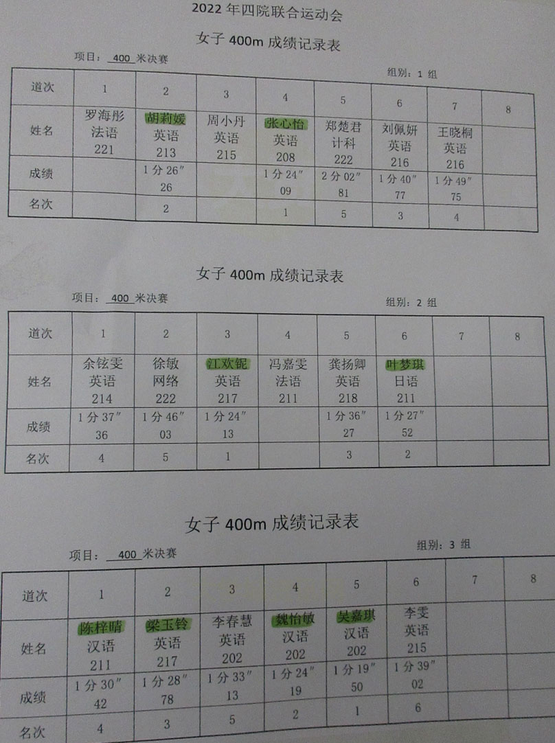 2022.10.22广大四院联合运动会 女子400米决赛(3组)成绩记录表 第一名 吴嘉琪 1分19秒50 汉语202 第二名 张心怡 1分24秒09 英语208 第三名 江欢铌 1分24秒13 英语217 第四名 魏怡敏 1分24秒19 汉语202 第五名 胡莉媛 1分26秒26 英语213 第六名 叶梦琪 1分27秒52 日语211 第七名 梁玉玲 1分28秒78 英语217 第八名 陈梓晴 1分30秒42 汉语211 二三四名都非常接近,差距在毫厘之间 |
