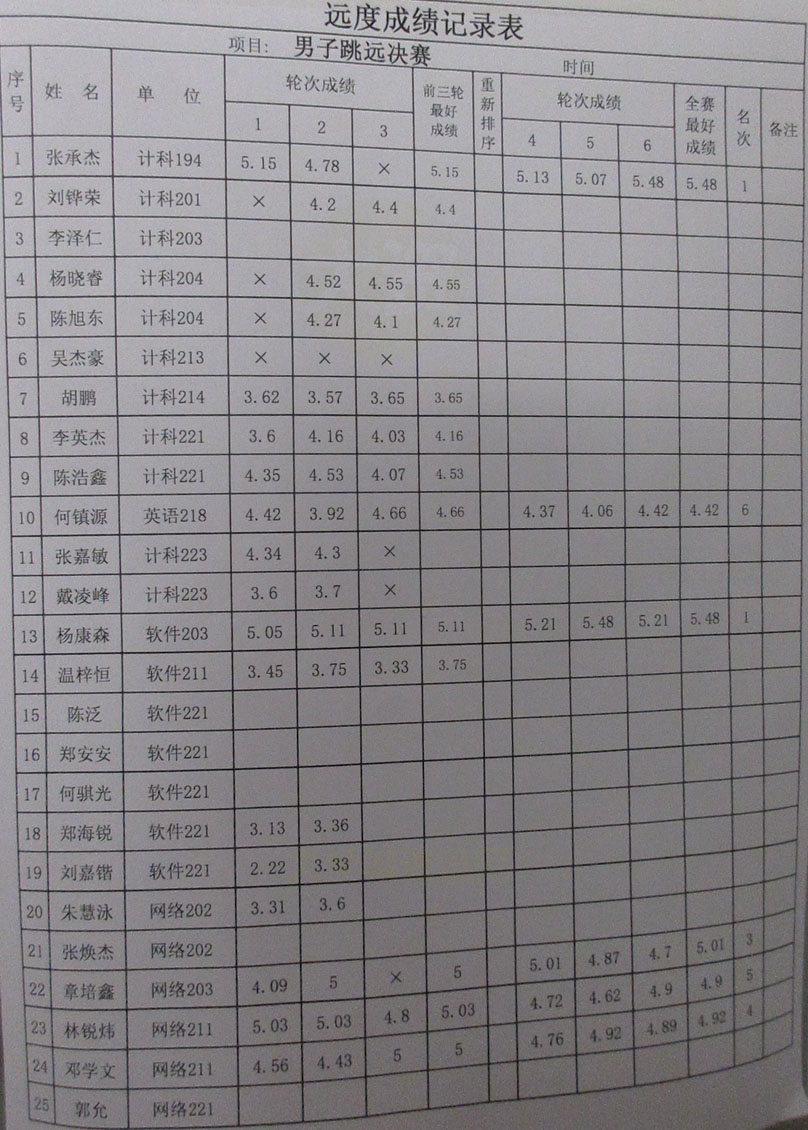计算机、外国语、人文、网安四院联合运动会 男子跳远决赛-远度成绩记录表