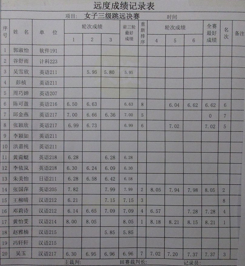 计算机、外国语、人文、网安四院联合运动会 女子三级跳远决赛-远度成绩记录表 第一名 黄怡雯 8米21 汉语214 第二名 张国萍 8米05 英语205 第三名 吴玉 7米37 汉语217 第四名 邓莉诗 7米28 汉语212 第五名 张颖欣 7米02 英语217 第六名 陈可盈 6米62 英语216 第七名 邱金燕 前三轮第5 英语217 第八名 王柳晴 前三轮第3 汉语212 |