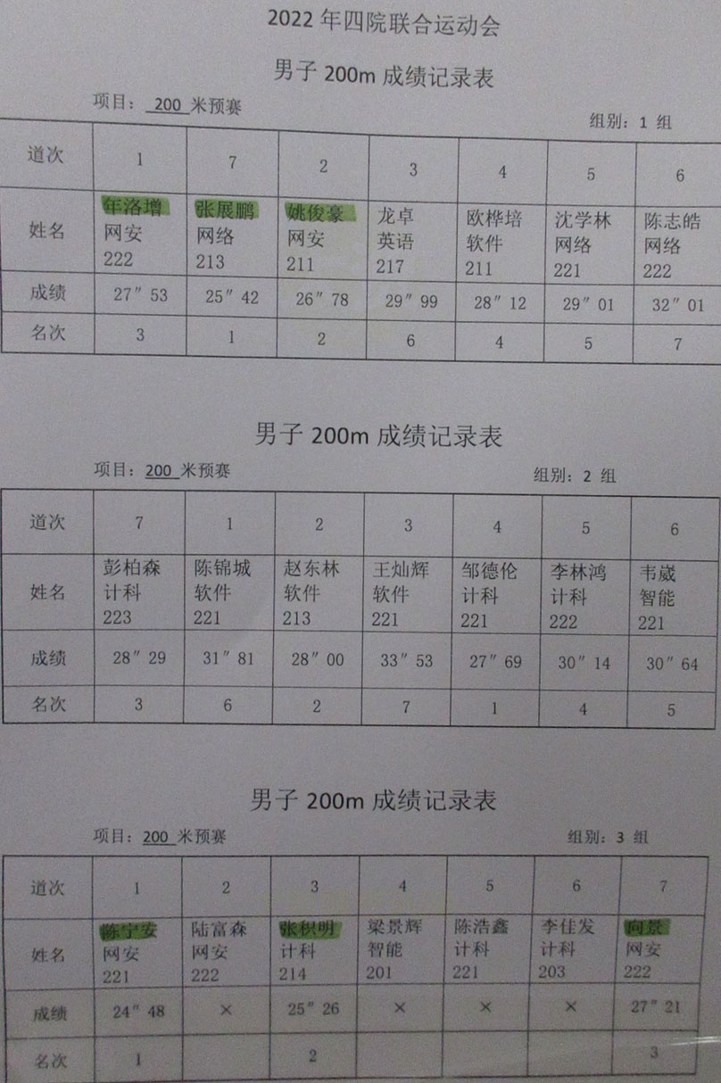 2022.10.22广大四院联合运动会 男子200米预赛(5组)成绩记录表 晋级男子200米决赛名单如下: 年洛增 27秒53 网安222 张展鹏 25秒42 网络213 姚俊豪 26秒78 网安211 陈宁安 24秒48 网安221 张积朋 25秒26 计科214 向景 27秒21 网安222 程威 27秒13 软件222 黄晓杰 24秒05 计科204 |