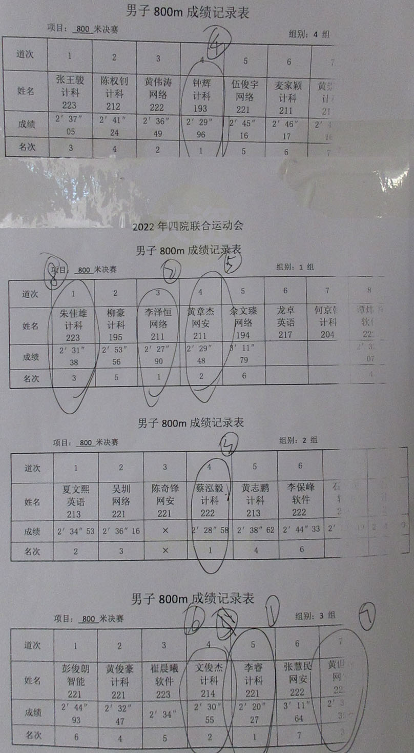 2022.10.22广大四院联合运动会 男子800米决赛(4个小组)成绩记录表 第一名:李睿 2分20秒27 计科221 第二名:李泽恒 2分27秒90 网络211 第三名:蔡泓毅 2分28秒58 计科222 第四名:黄章杰 2分29秒48 网安211 第五名:钟辉 2分29秒96 计科193 第六名:文俊杰 2分30秒55 计科214 第七名:黄世森 2分31秒33 网安222 第八名:朱佳雄 2分31秒38 计科223 |