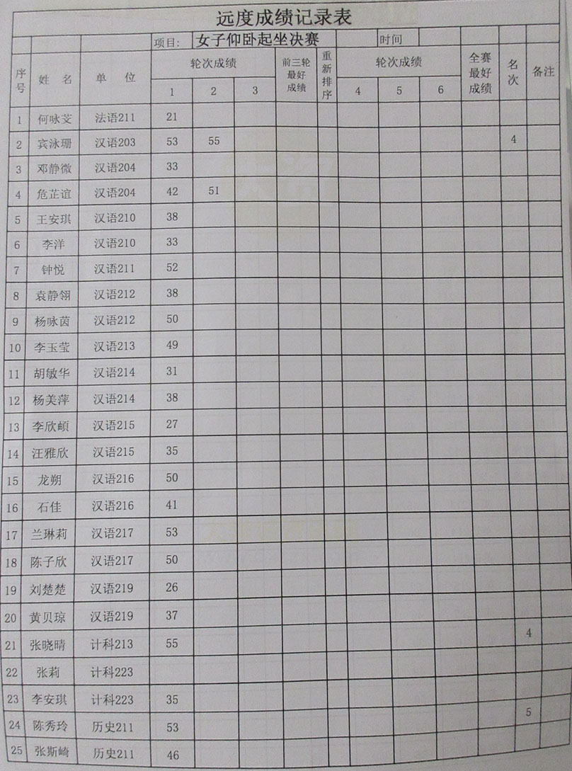 计算机、外国语、人文、网安四院联合运动会 女子仰卧起坐决赛-次数成绩记录表 第一名:刘可欣 64次 日语212 第二名:郭静怡 62次 软件212 第三名:李琳宇 57次 英语217 第三名:曾颖静 57次 英语218 第四名:宾泳珊 55次 汉语203 第四名:张晓晴 55次 计科213 第四名:蒋启晨 55次 软件223 第五名:陈秀玲 53次 历史211 |