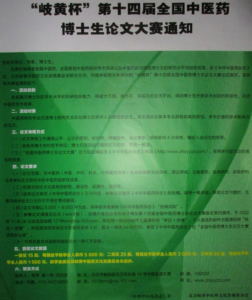 | 岐黄杯·第十四届全国中医药博士生论文大赛通知 奖项设置:一等奖15篇 每篇5000元,二等奖25篇 每篇3000元,三等奖60篇 每篇1000元 | ||||||