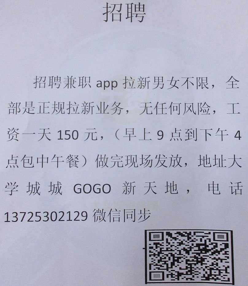 招聘兼职app拉新男女不限 工资一天150元,早上9点到下午4点包中餐 地点大学城新天地 电话13725302129