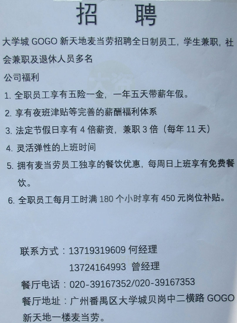大学城新天地麦当劳招聘全职员工,学生兼职、社会兼职及退休人员多名 联系13719319609何经理