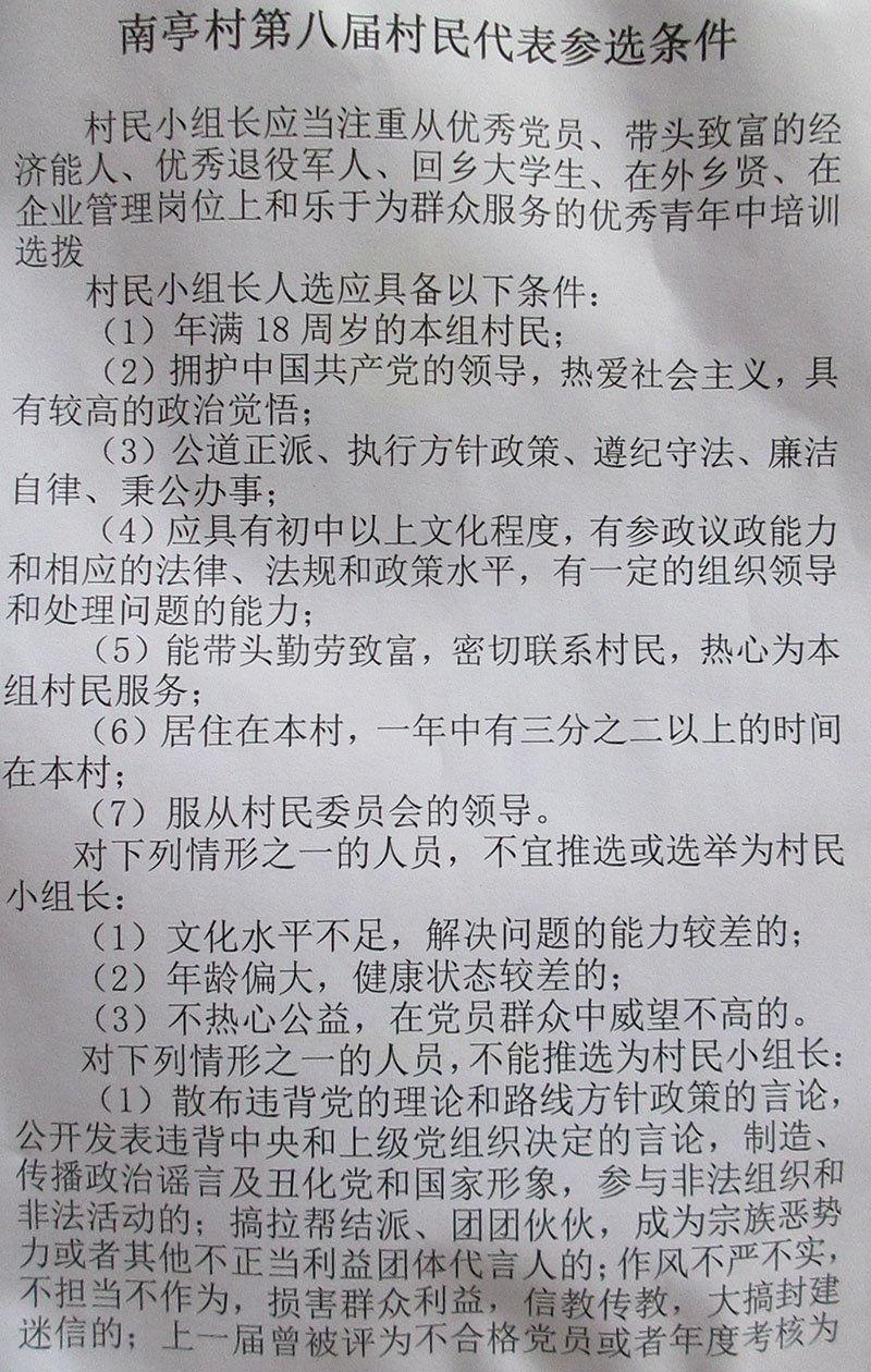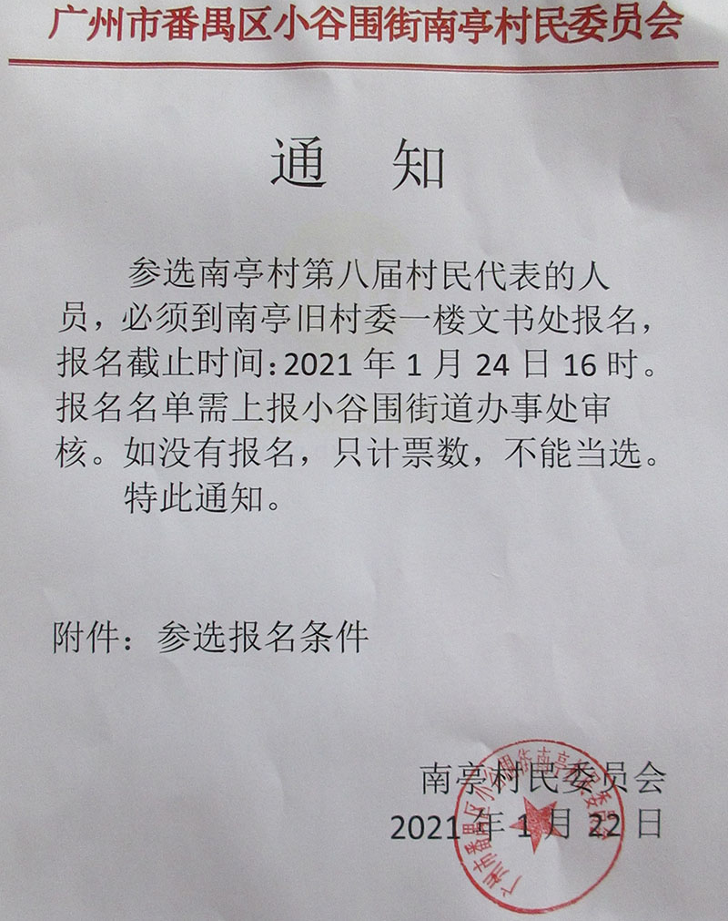 参选南亭村第八届村民代表需到村委文书处报名通知 截止1月24号下午16时 附参选报名条件