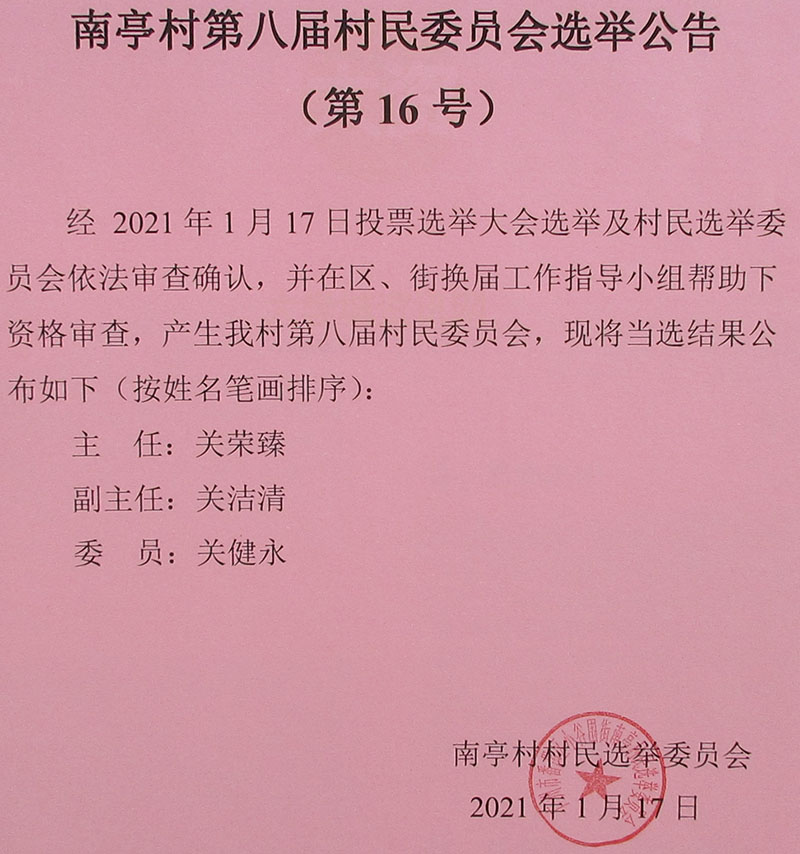 南亭村第八届村民委员会第16号选举公告-村委选举结果确定-通知 |