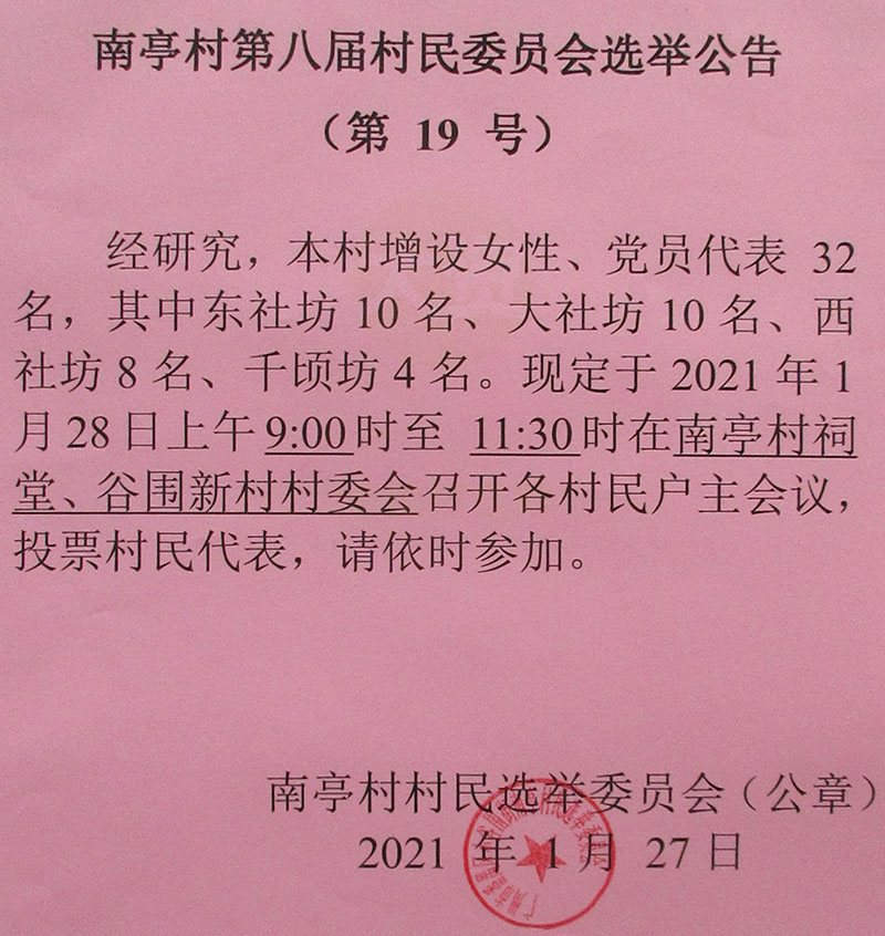 南亭村第八届村民委员会选举之增设女性、党员代表投票选举公告 |
