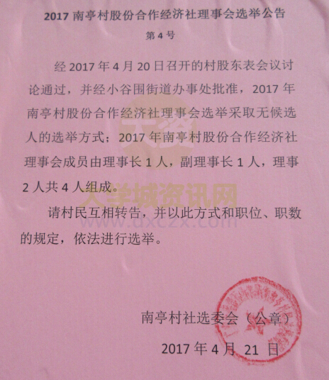 | 2017南亭村股份合作经济社理事会选举公告(第4号) | ||||||