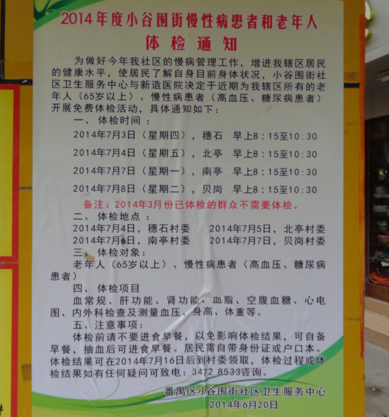 | 2014.07.01周一-2014年度小谷围街慢性病患者和老年人体检通知发布(涉及四村) | ||||||