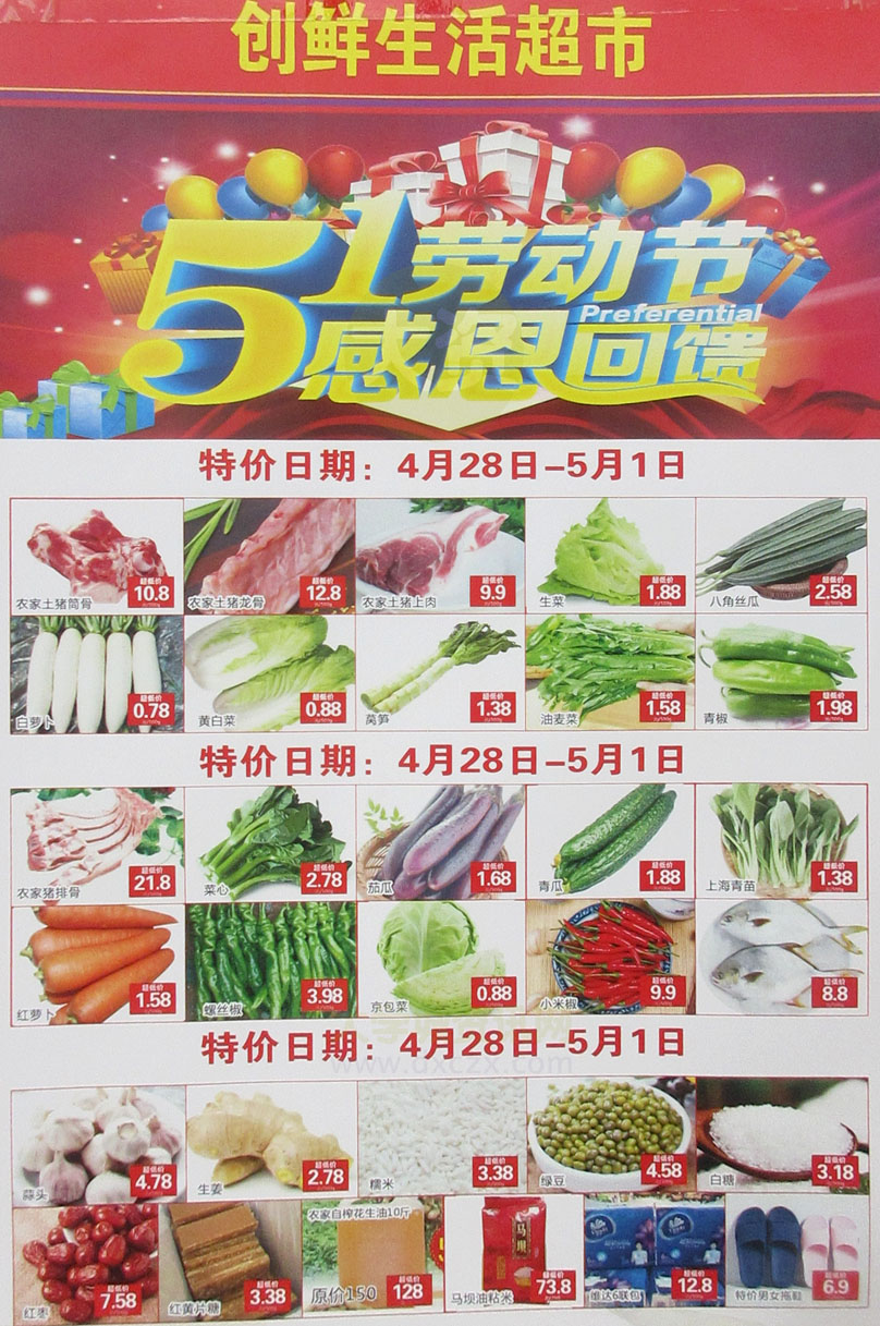 | 南亭大道中-创鲜生活超市 5.1劳动节感恩回馈 多种蔬菜及商品特价 时间4月28日-5月1日 | ||||||