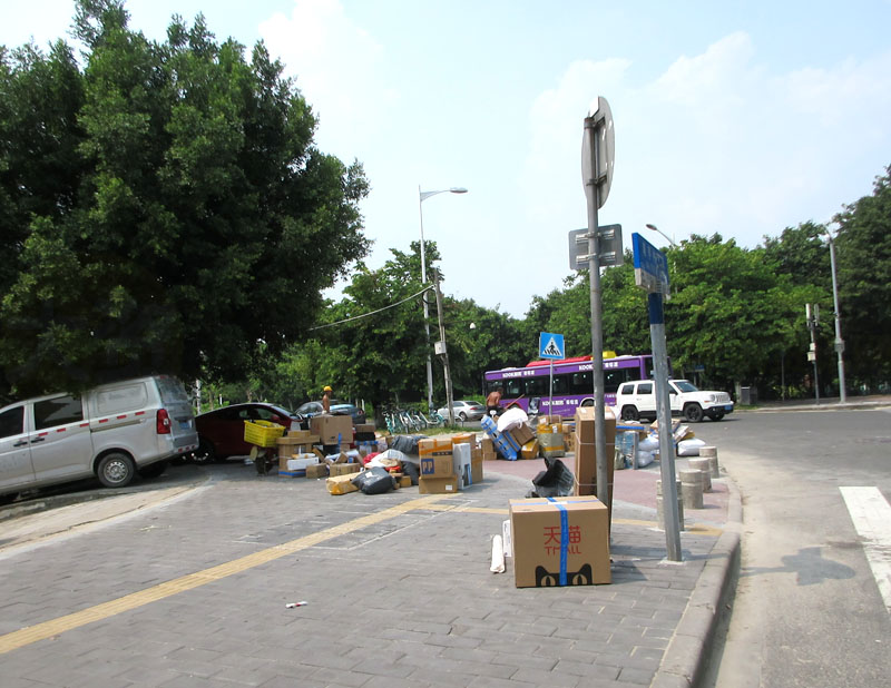 | 南亭村口弯角辅道上,好像少有地见到摆放了很多快递包裹喔 | ||||||