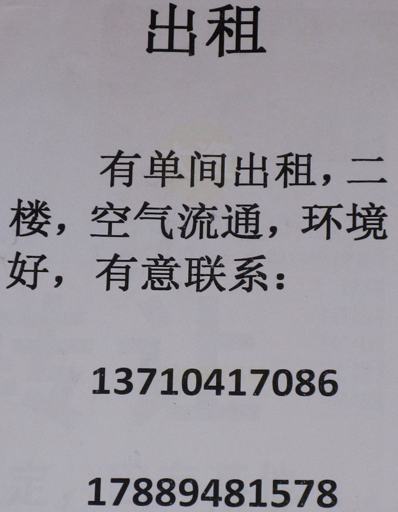 | 有单间出租,二楼,空气流通,环境好,有意联系:13710417086 17889481578 | ||||||
