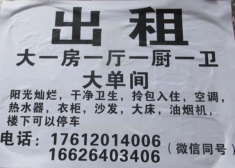 | 南亭 出租 大一房一厅一厨一卫 大单间 阳光灿烂,干净卫生,拎包入住,空调,热水器,衣柜,沙发,大床,油烟机,楼下可以停车 电话:17612014006 | ||||||