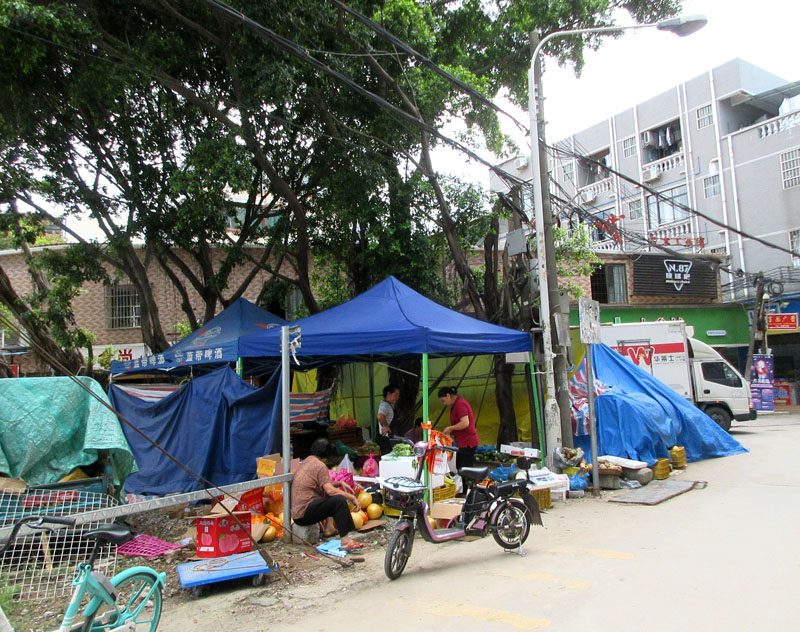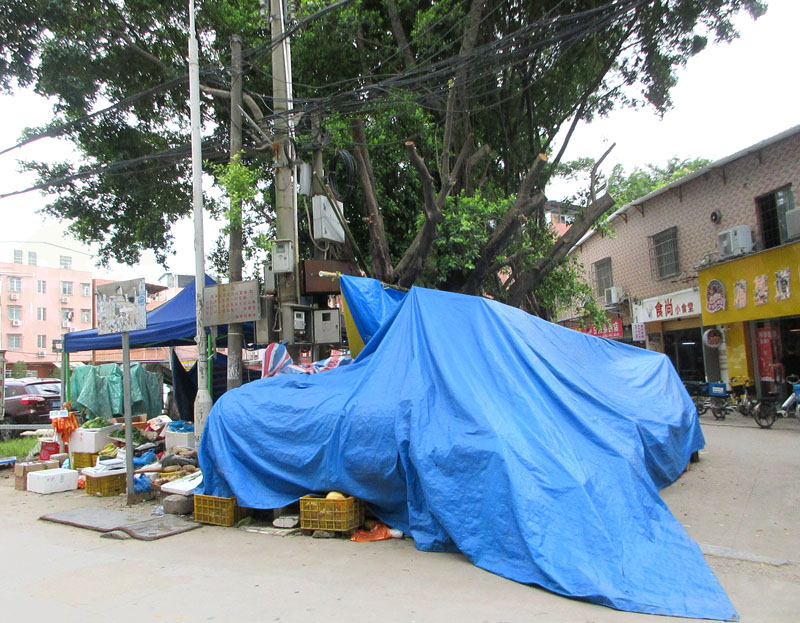 南亭原市场南角摆地摊卖水果的,看到把据点帐篷移到里面位置了,外面原来的摊位都盖起来了,可能是文明城市的注意和需要?有几颗树挡着,感觉遮照和防护都升级了,摊位更稳固安全的即视感