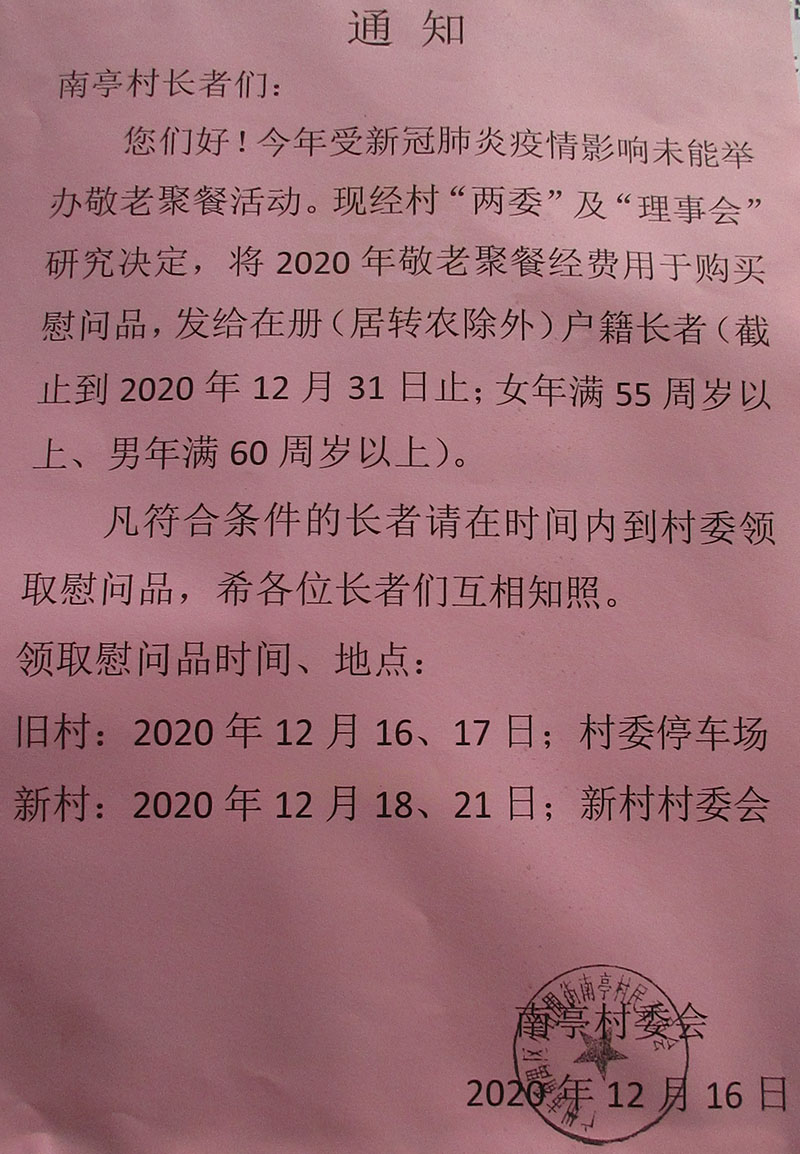 | 疫情影响,今年敬老不聚餐 换作在册户籍长者领取慰问品--通知 | ||||||