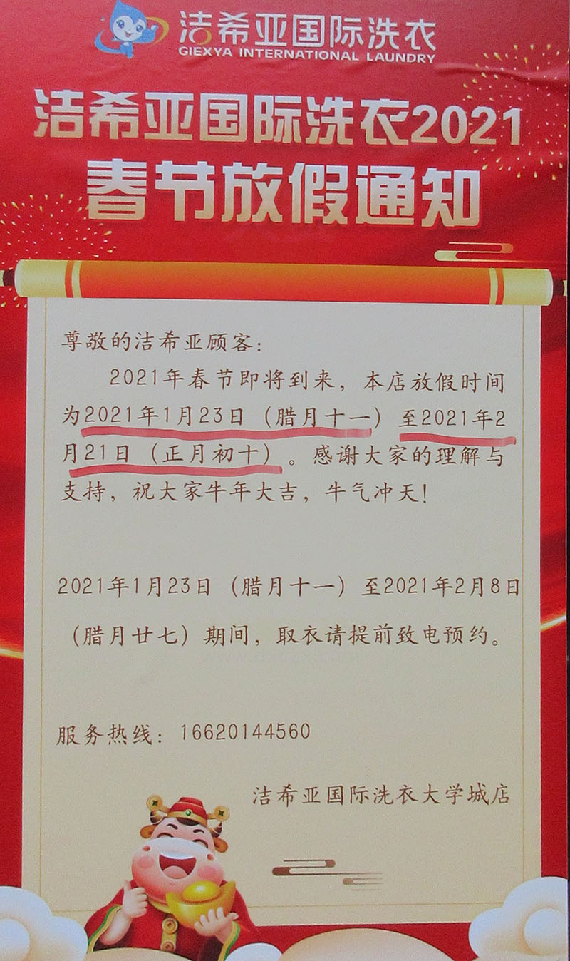 | 西社大街中-杰希亚洗衣店春节过年期间放假时段安排 | ||||||