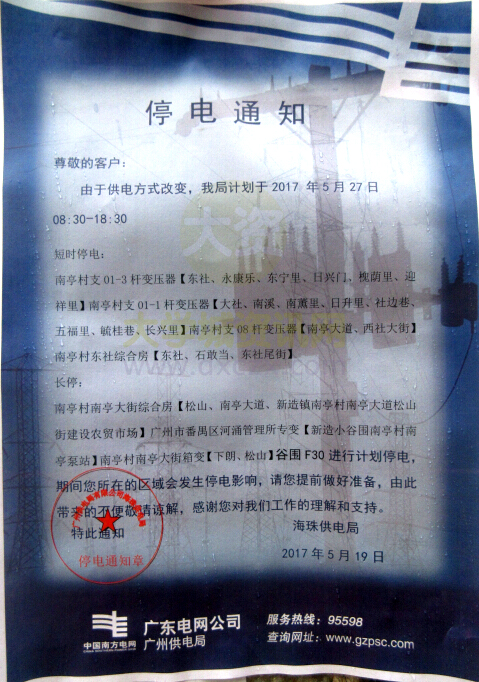 | 南亭村停电通知2017年5月27日08:30-18:30 | ||||||